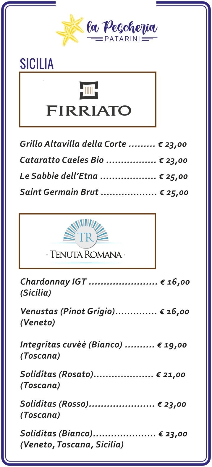 La Pescheria Patarini in sostanza offre un sevizio ristorante dove ci sono anche antipasti, primi, secondi e contorni di ogni genere così come svariate tipologie di bevande. Inoltre va sottolineato che essendo il menù tipicamente di mare con qualche aggiunta di prodotti di terra come insalate e verdure grigliate, il pesce oltre che cotto si può anche degustare crudo ovvero nel modo tipico in cui i giapponesi preparano il tradizionale sushi.